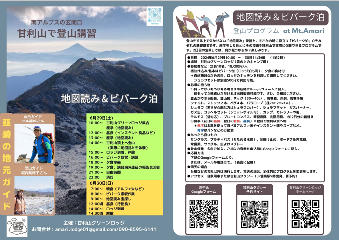 登山をする上で欠かせない「地図読み」技術と、まさかの時に役立つ「ビバーク泊」のそれぞれの基礎講習です。座学をしたあとにその技術を甘利山で実際に体験できるプログラムです。2日目の宝探しでは、何が見つかるか?楽しみです。