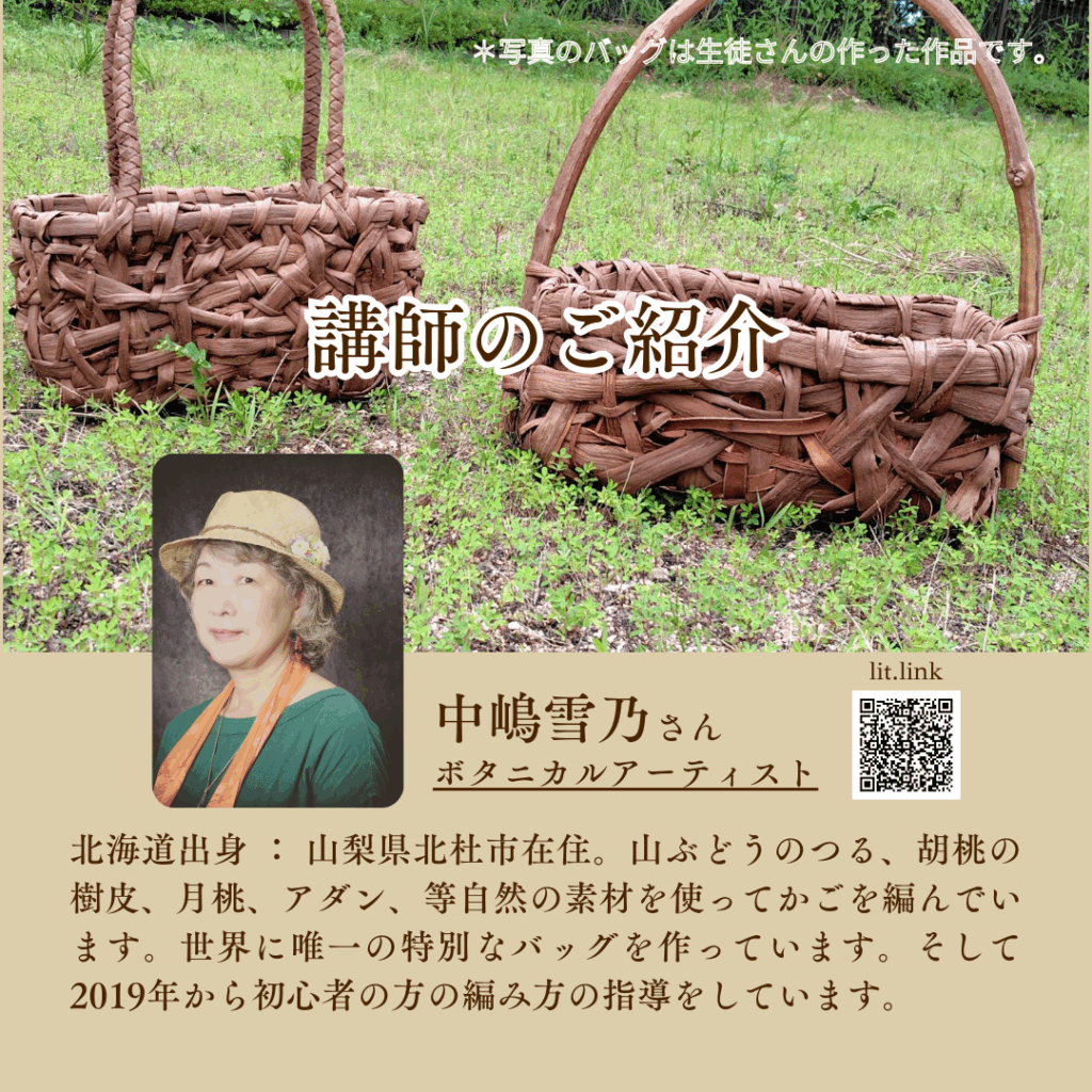 講師を務めていただきますのは、お隣北杜市でご活躍中の中嶋雪乃さん。ボタニカルアーティストである中嶋さんに、ヤマブドウの特徴や作り方の手ほどきを受講していただきます。
