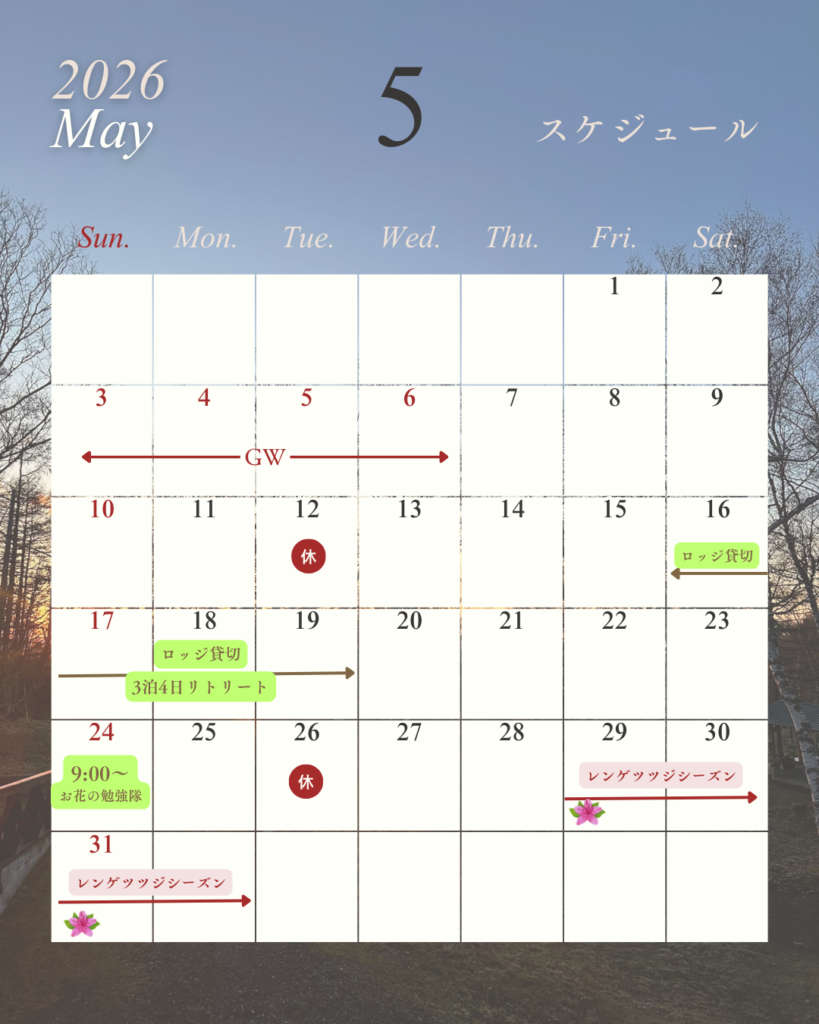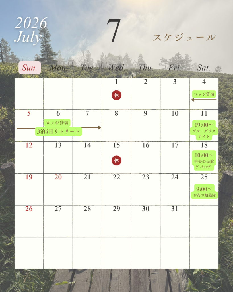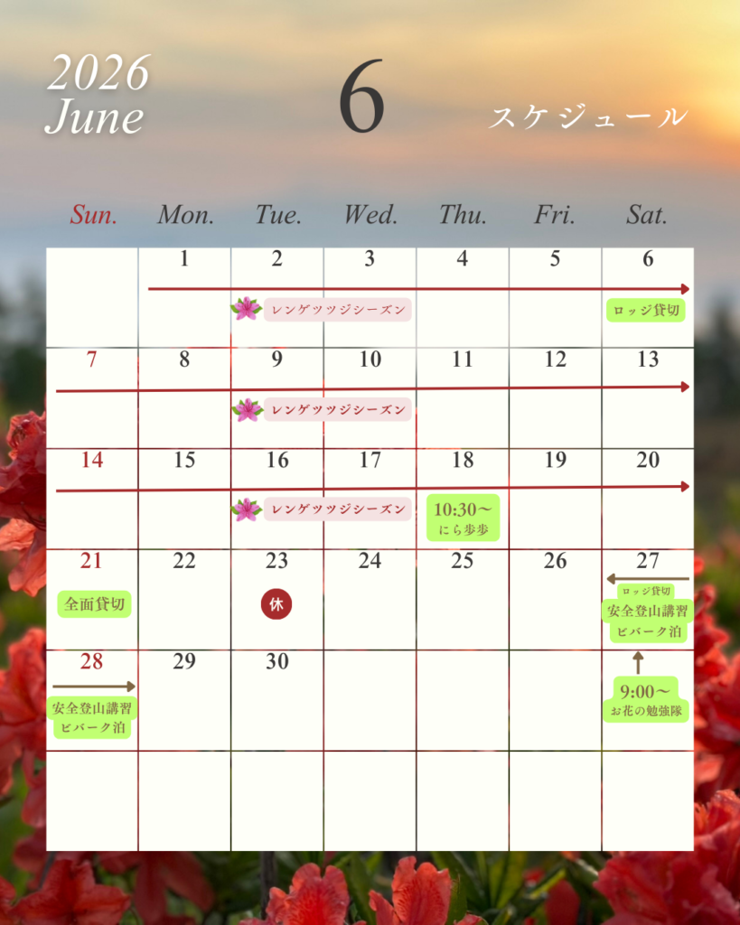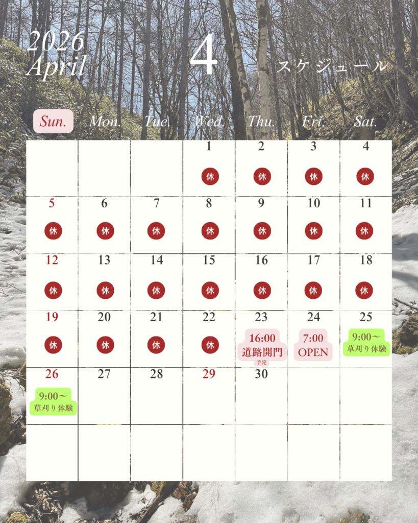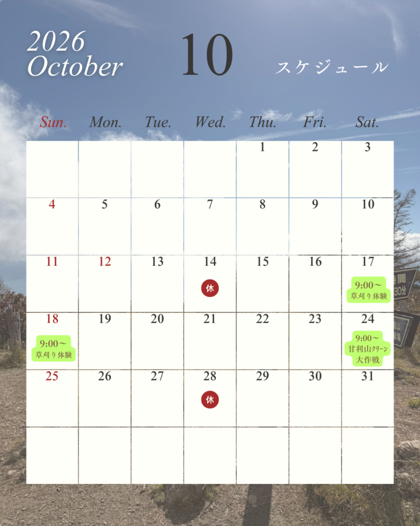 2026年のシーズンスタートも目前となりましたが、今朝の甘利山は下からも雪が積もっているのがはっきりと分かります。はたして無事オープンなるか?いささか不安ではありますが、2026年度のイベント等の現時点でのスケジュールをお知らせいたします。 イベントスケジュールは予告なく変更となる場合がありますので、直近になりましたらInstagramやFacebookで再確認をお願いいたします。 投稿ナビゲーション ⭐『甘利山に咲くお花の勉強隊』のお知らせ